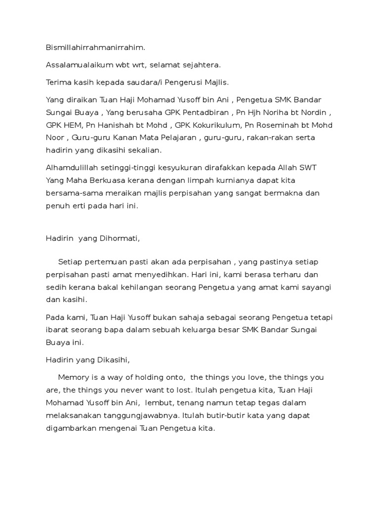 . Teks Ucapan Ketua Pengawas Sempena Persaraan Ustazah Hazizah. Suasana sambutan Ramadhan Hari Raya Aidilfitri begitu uga dengan Pesta Keamatan dan Hari Gawai pada tahun ini sememangnya sangat. Teks ucapan wakil murid sempena hari guru.